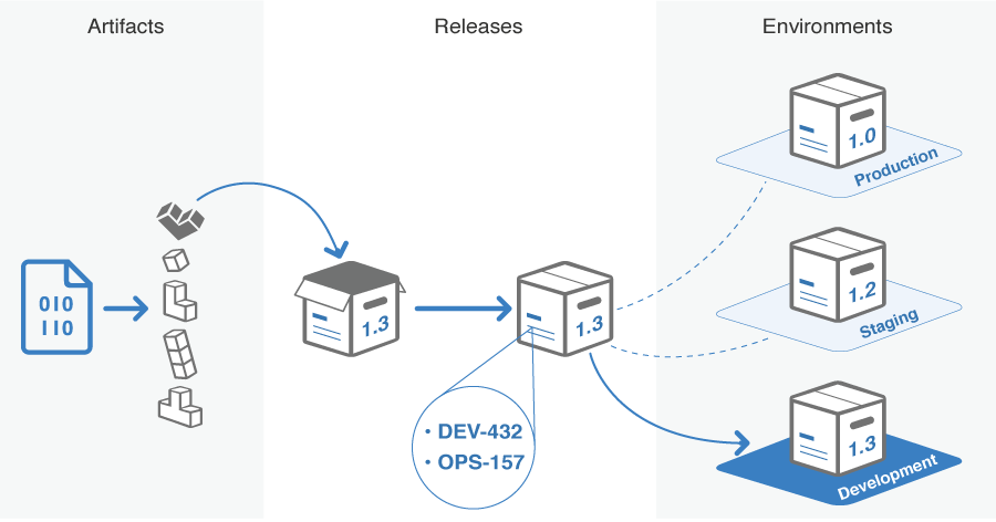Any artifacts that have been tested to your satisfaction using a plan can be used to create a release. Bamboo preserves metadata related to your release, such as the JIRA issues and commits included. This allows for tracking changes across environments, easy traceability when troubleshooting, and creating powerful reports.Environments